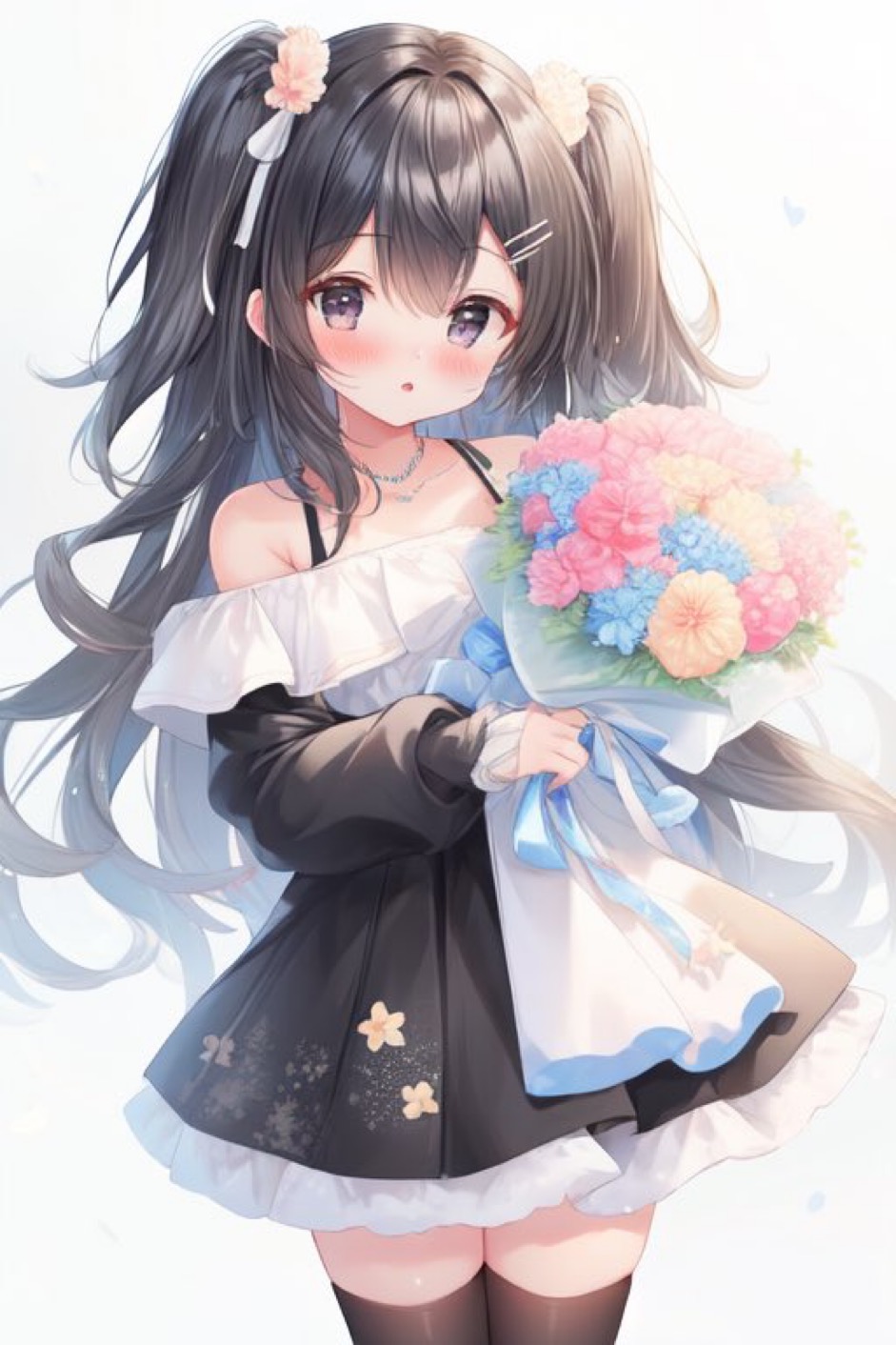 ゾーカちゃん 私(くーにゃん)を描いてくれてありがとうございます⭐️ 周りがお花畑でとっても幸せそうな私すごく可愛いのです🖤 お花を持ってすごくニコニコしている私が素敵なのです🥰