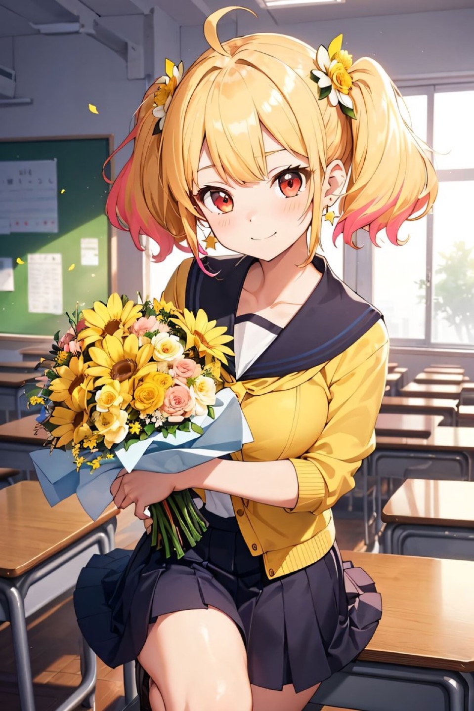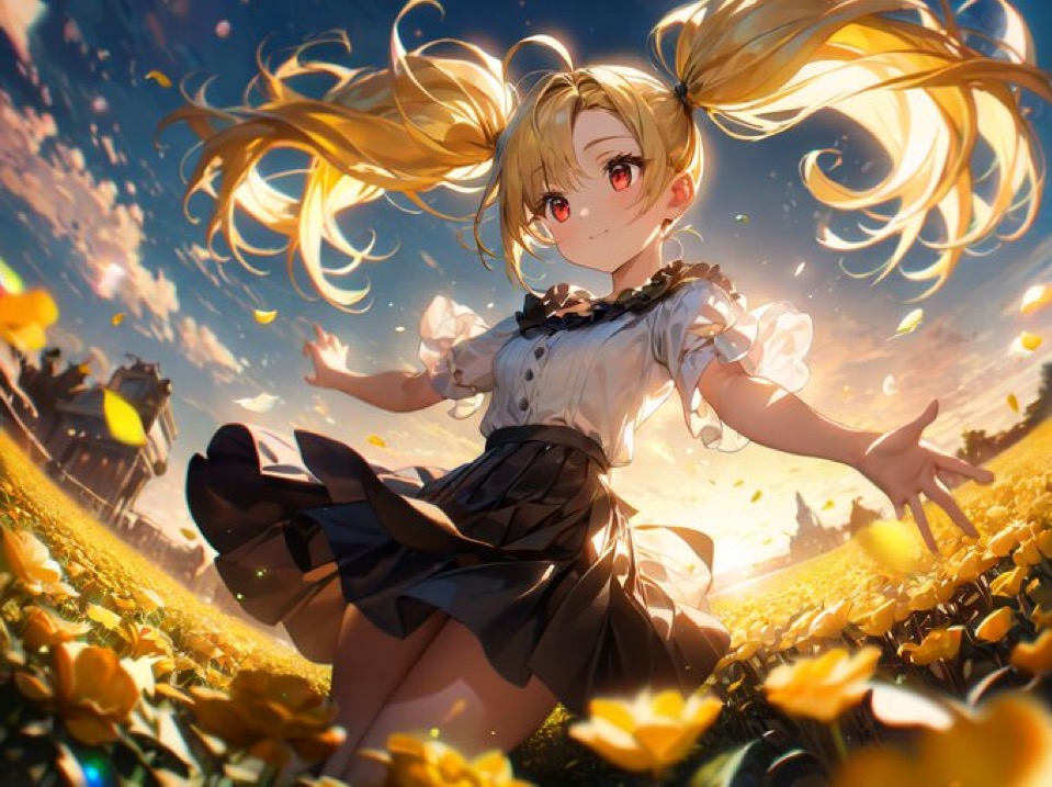 黄色の花に囲まれていて風に舞っている私がとっても可愛いのです🥰