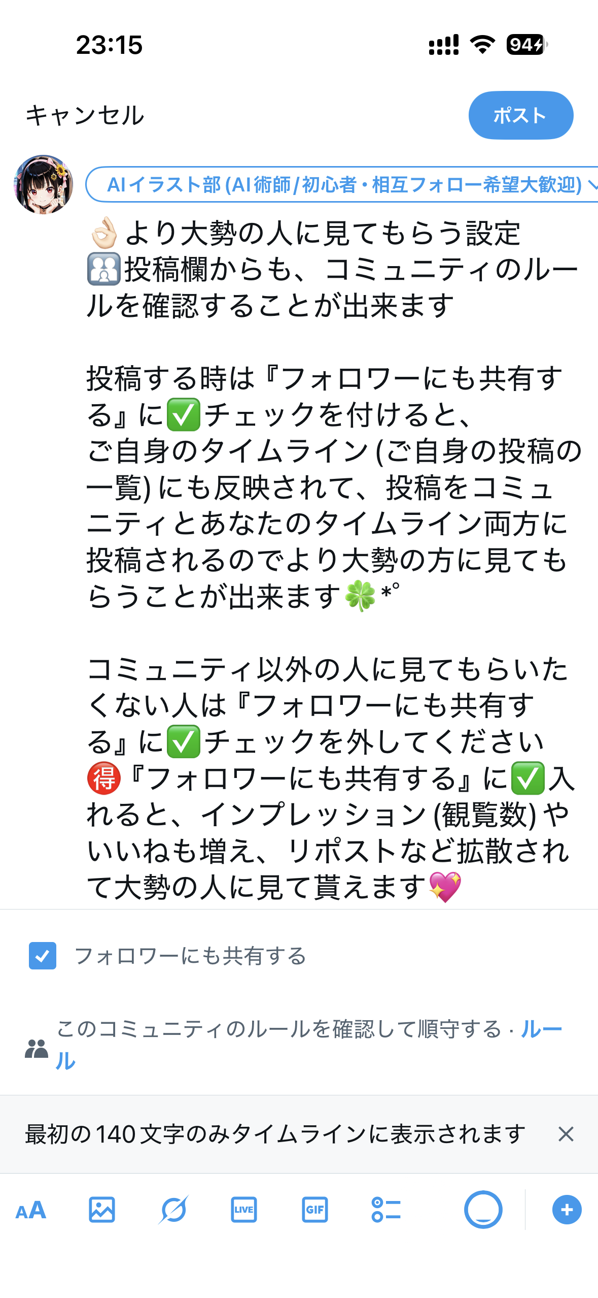 💖投稿する時は『フォロワーにも共有する』に✅チェックを付けると、