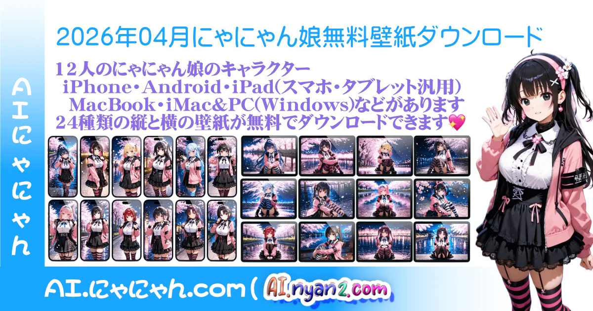 “26年04月A(A05) みあにゃん壁紙(スマホ用・縦タブレット)” をダウンロード 2604a1-a05a-mianyan.webp – 1 回のダウンロード – 574.33 KBみあにゃん(横型) タブレット・PC用・スマホも一応可